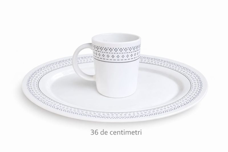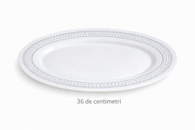 Platou din opal de foarte bună calitate, ideal pentru servire. Design elegant cu inserții albastre. Ușor de întreținut, compatibil cu microunde și mașina de vase. Dimensiune: 36 cm.
